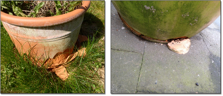 Afin de faciliter la transition et l'évacuation du surplus d'eau, le pot nécéssite d'être surèlevé. Placez des supports, des lattes en bois, ou comme sur les photos des "pattes en terracotta" ( plus élégant pour les grosses pièces). De telle manière à ce que la base du pot ne soit aucunement soumise à une pression de l'eau, qui en période hivernale peut se révéler fatale.